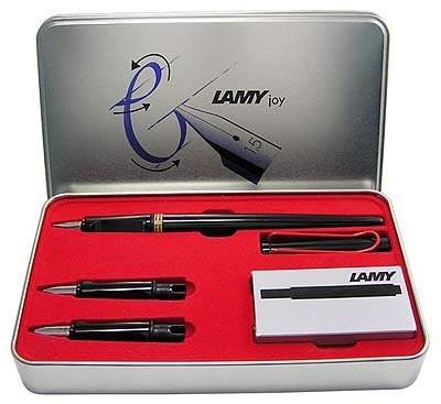 Lamy Joy Calligraphy Black Fountain Pen Set Red Clip;LAMY Joy, a fountain pen that inspires beautiful, creative writing, an expression of personality and individuality;Ergonomic design, comfortably in the hand;Made of shiny plastic with soft black lacquer finish;Ergonomic grip section and flexible clip of spring brass wire;Lamy Joy Caligraphy Black Fountain Pen Set in an attractive metal gift box. This box contains a LAMY Joy fountain pen, three exchangeable nibs (widths: 1.1, 1.5 and 1.9 mm), a package with 5 ink cartridges and a brochure;System: Accepts cartridge or converter refill;Nib type: Stainless steel nib with 1.1, 1.5 or 1.9 mm chisel point;* Fountain pen converter is not included